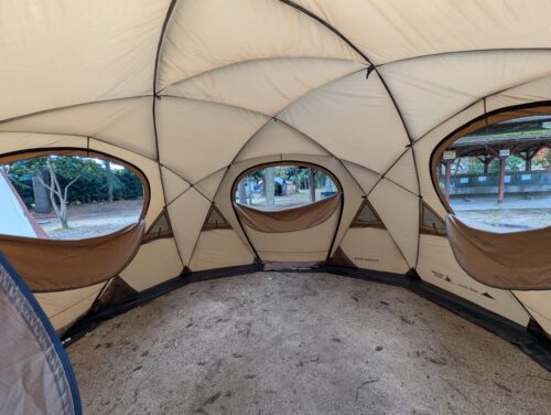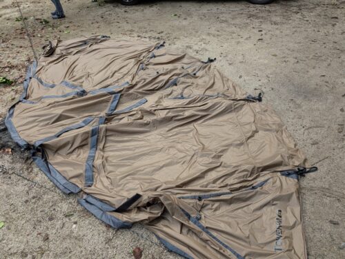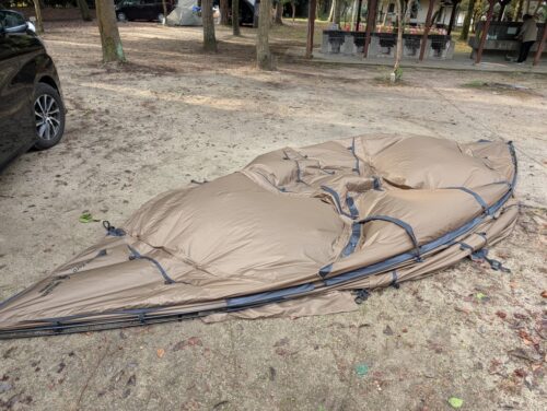 内側に結露もなく、濡れてなければ、このまま畳んで収納バッグに入れれば終わるのですが、今回は地面が砂。濡れたテント、特にスカートの部分に砂が沢山付くので、払うだけ払い、とりあえず車にそのまま入れました。