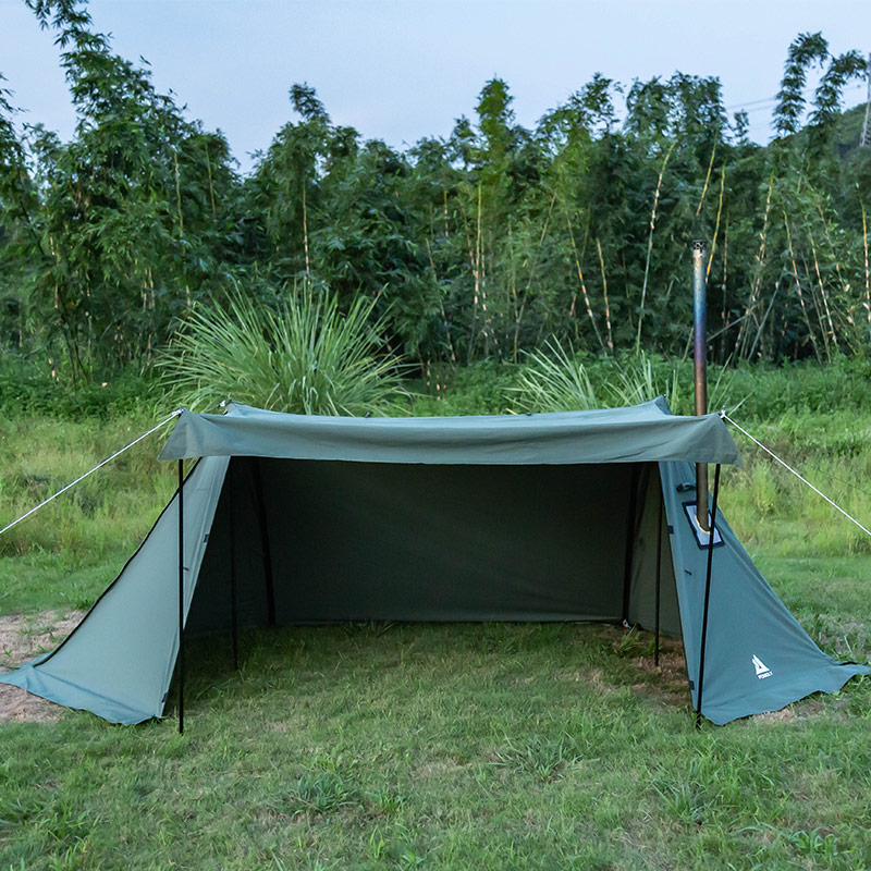 今回はパップテントの一般的なサイドの間から煙突を突き出す方法で進めますが、ファスナーがダブルジッパーで、下はファスナーを閉めても上の部分が開放できるタイプが前提となります。