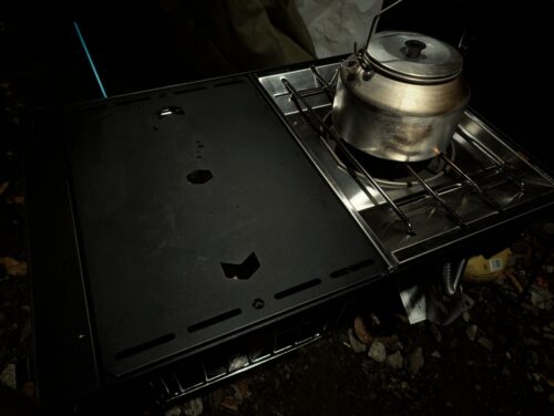 暗くて見づらいですが、キャンピングムーンのブリッジフレーム(2ユニット対応)。右のユニットにはフラットバーナー。左のユニットには、普段は1ユニットサイズのまな板を置いてますが、写真ではフラットバーナー用のカバーが置いてあり、その下に水切りカゴが付いてます。