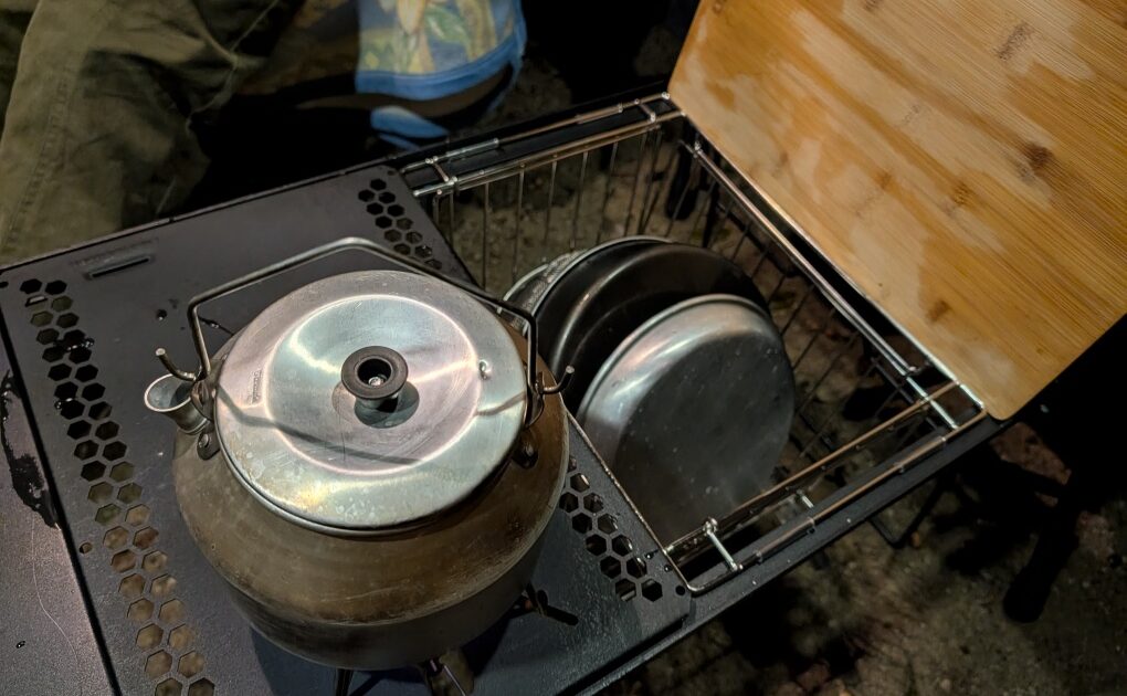 暗くて見づらいですが、キャンピングムーンのブリッジフレーム(2ユニット対応)。右のユニットにはフラットバーナー。左のユニットには、普段は1ユニットサイズのまな板を置いてますが、写真ではフラットバーナー用のカバーが置いてあり、その下に水切りカゴが付いてます。