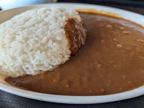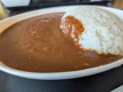 カレーの味は?何か特徴があるわけではなく、辛過ぎず甘過ぎず。ある意味普通の業務用カレーなのかもしれませんが、普通に美味しい。カレーは飲み物じゃないですが、勢いであっという間に完食でした(この量は勢いで行かないと)。