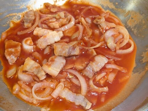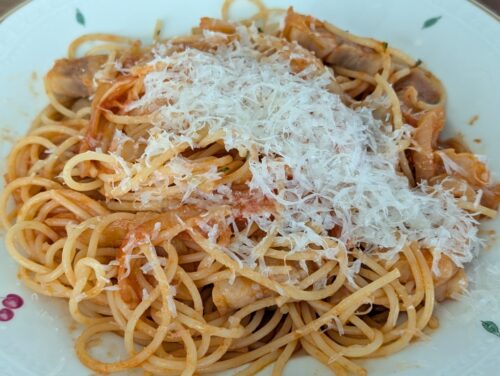 後日再度トライ。パンチェッタからも脂も出たし、タマネギもいい感じに火が通り、トマトソースもいい感じに仕上がりました。