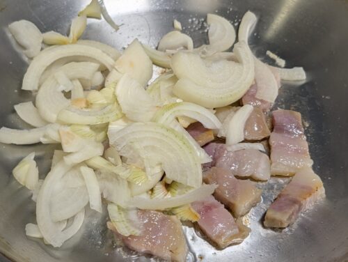 火加減が慣れてないので難しいのですが、脂が出てきたらタマネギを入れます。気持ちもう少しパンチェッタが焦げ付いても良かったか?