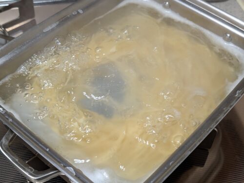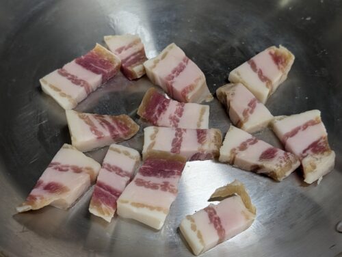 まず切ったパンチェッタをフライパンでゆっくり炒めていきます。