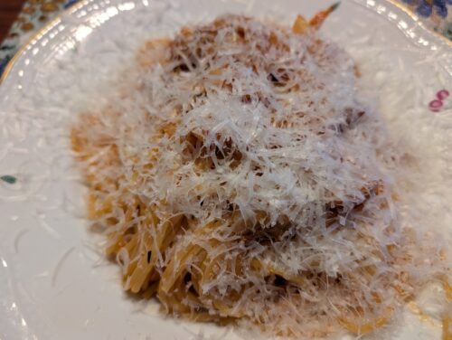 お皿に盛り付けて、ペコリーノロマーノを少し振りかけて完成です。削りながらチーズの振りかけ方が下手なんです。もう少し全体的にかけたい。